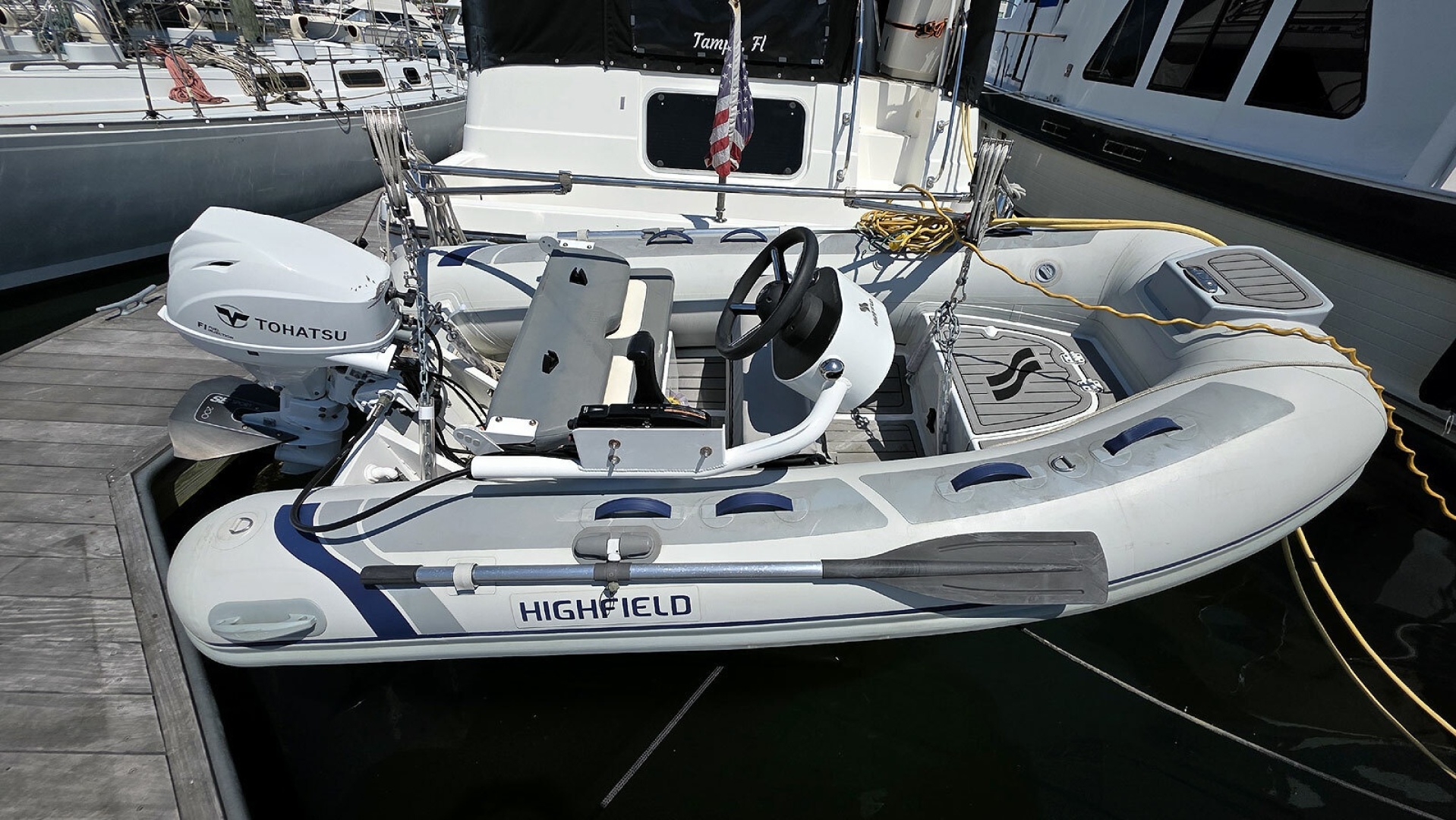 Additional highlights include a Highfield CL-310 aluminum RIB tender with a 20 HP Tohatsu outboard and a complete Raymarine electronics suite.
