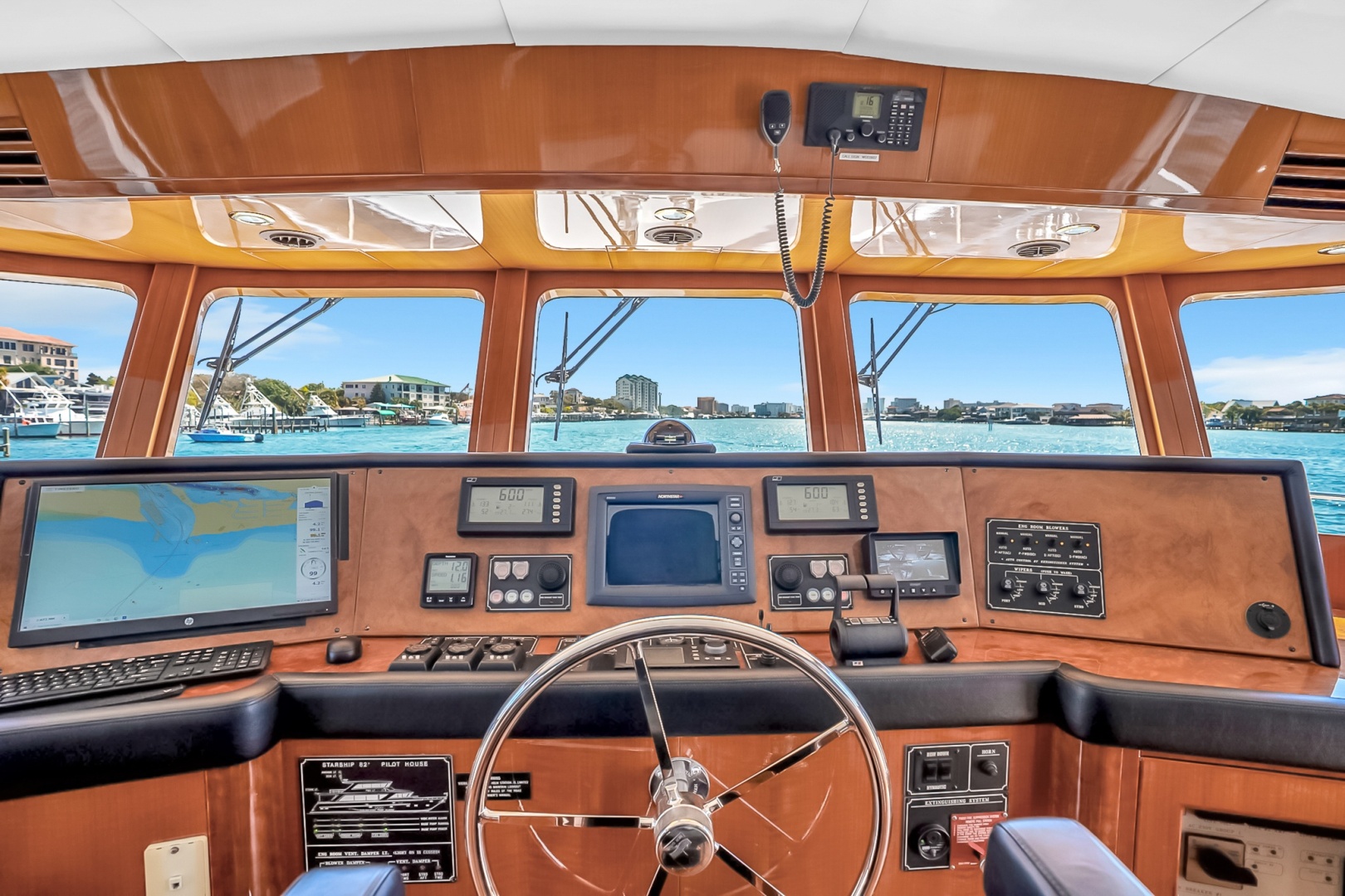 Ample seating arrangements create a comfortable environment for hosting guests or enjoying time aboard. Rich wood joinery and cabinetry throughout the interior reflect the craftsmanship associated with yachts of this class.