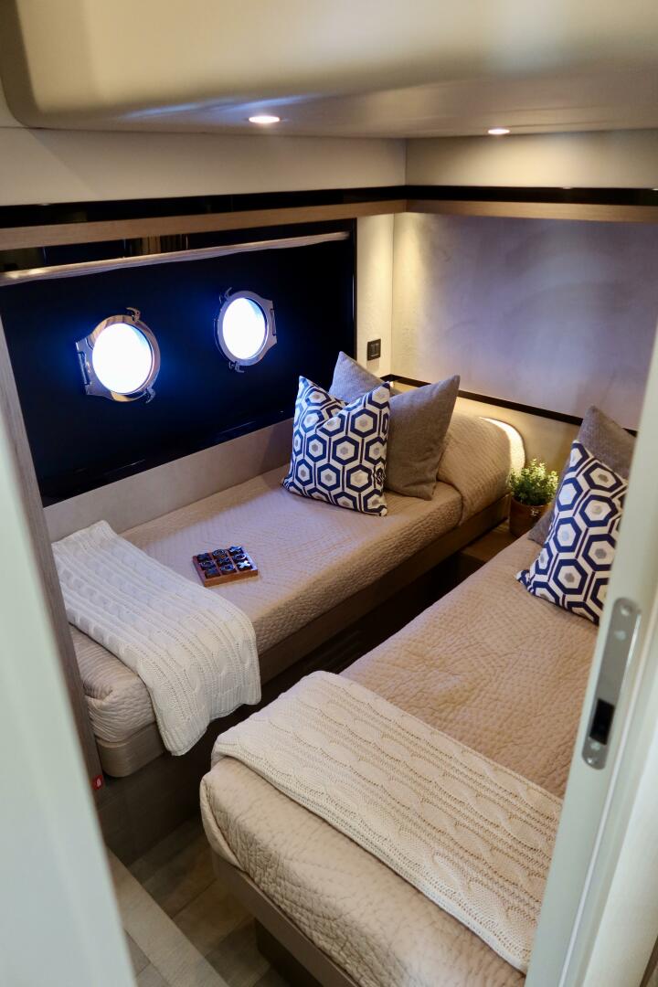 Fourth Aft Cabin Equipped w/ (2) Beds, Furniture in Walnut Wood, Wardrobe, Opening Porthole, Large Window, HPL Floor, Separate Toilette w/ WC, Basin, Shower, Independent Access From Aft Platform & Open Door