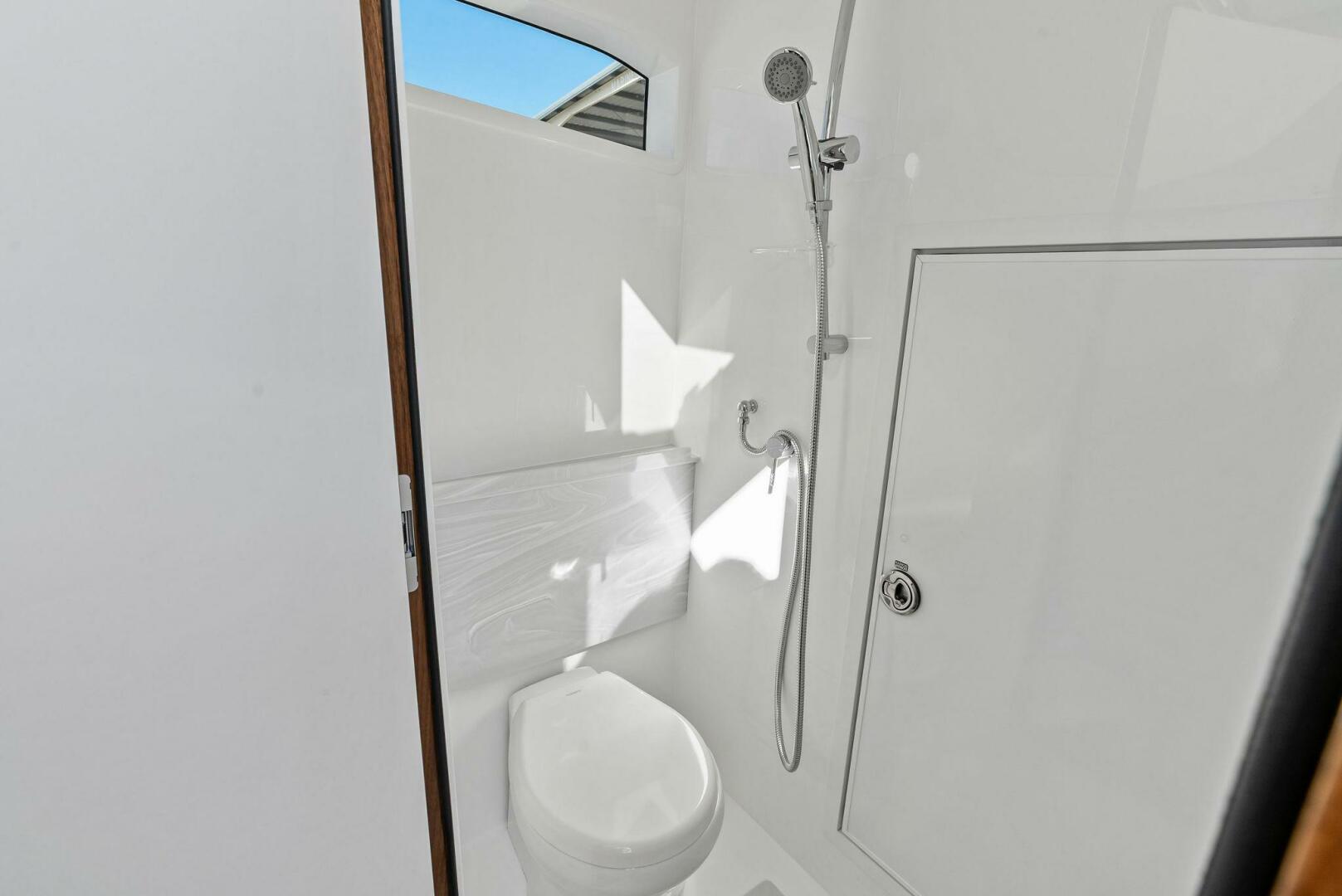 You'll immediately notice the headroom (6' 7") and free-flowing open layout that's filled with natural light flowing through four shapely portlights. Forward, a dinette with U-shaped seating and bolstered backrest surrounds a drop-down table that converts to a queen berth. On the starboard side is the galley, which features a polished Corian countertop, stainless steel sink, brushed nickel and chrome faucet, two-burner recessed stove, refrigerator/freezer, microwave oven and cabinet storage. Directly aft of the galley is the private head with a molded-in vanity with freshwater sink and faucet, toilet and shower.